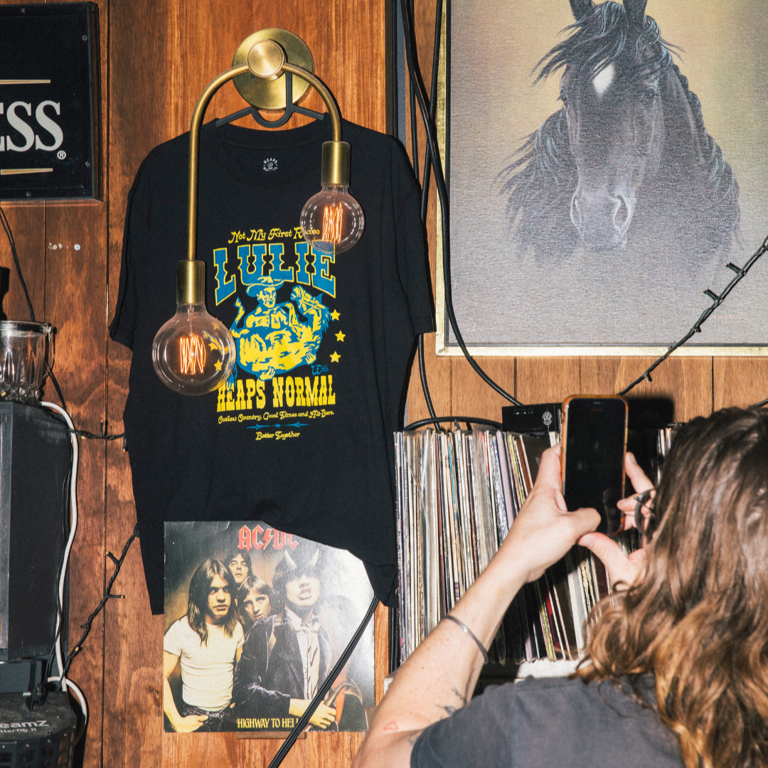 It ain't our first rodeo with our mates at Naarm's Lulie Tavern. Inspired by classic country music tour shirts, this super limited edition, 100% recycled cotton shirt design by our mate Pat Rogasch gives big horse energy.